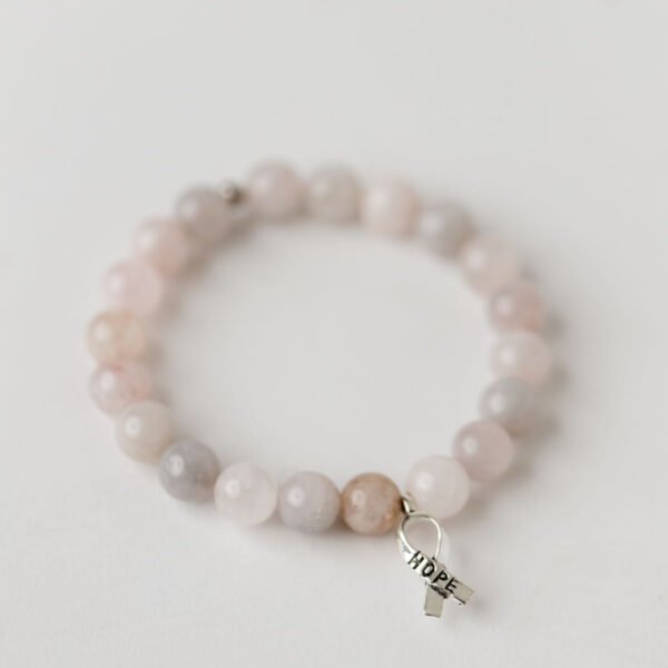 What a fantastic way to spread awareness and show your support!? Our Hope Bracelet is made from semi-precious rose quartz stones on a one-size-fits-most stretch cord.? Choose from a silver or gold ribbon charm with the word Hope etched in.? Not only are you showing your support for cancer awareness. you are supporting at-risk individuals in Haiti with your purchase.